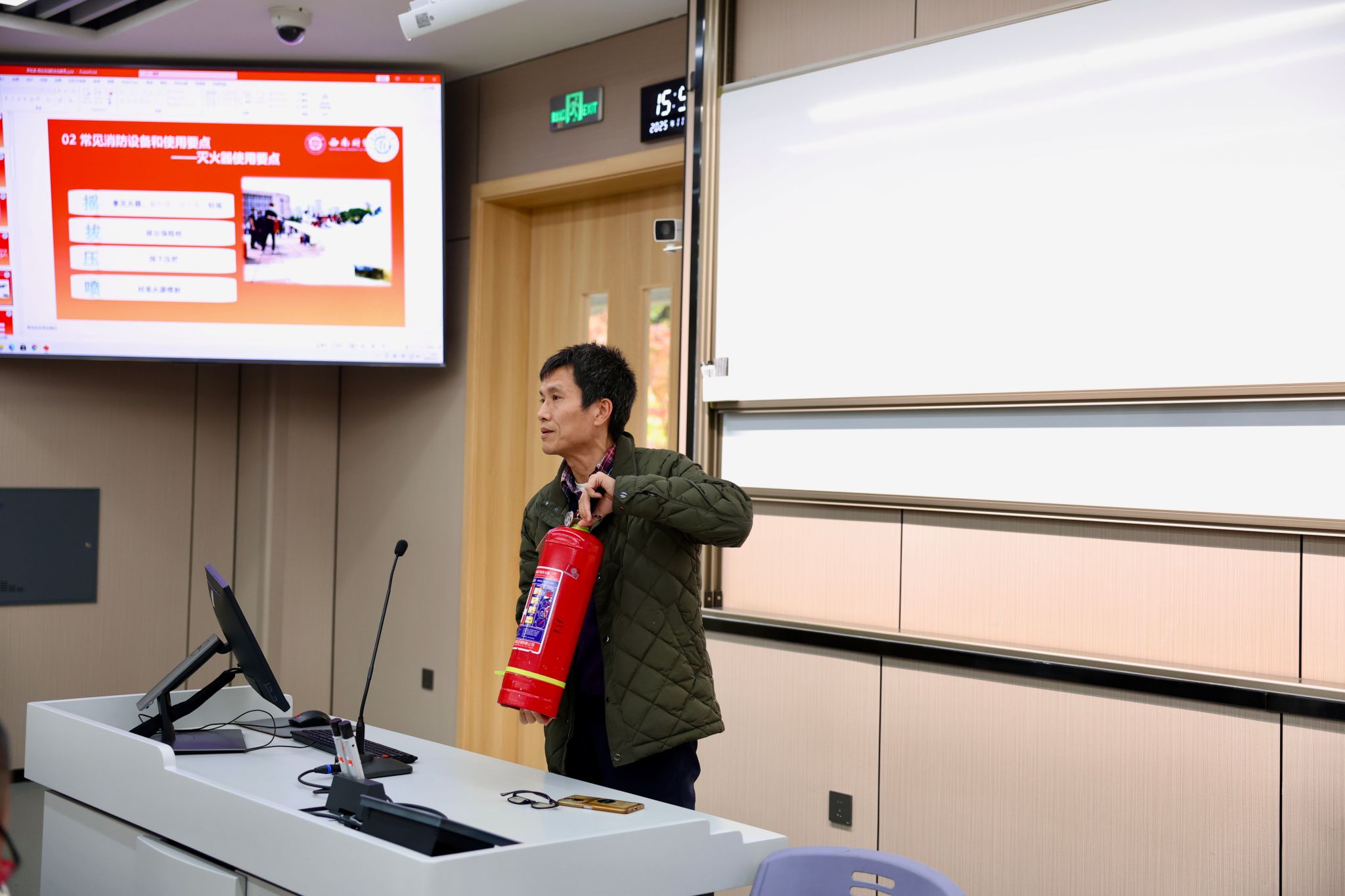 他现场演示了灭火器的正确使用方法,并提醒同学们严格遵守公寓管理规定。此外,他还就外出及校园周边活动的个人安全作出提示,特别强调了山洪、泥石流等突发自然灾害的防范知识。