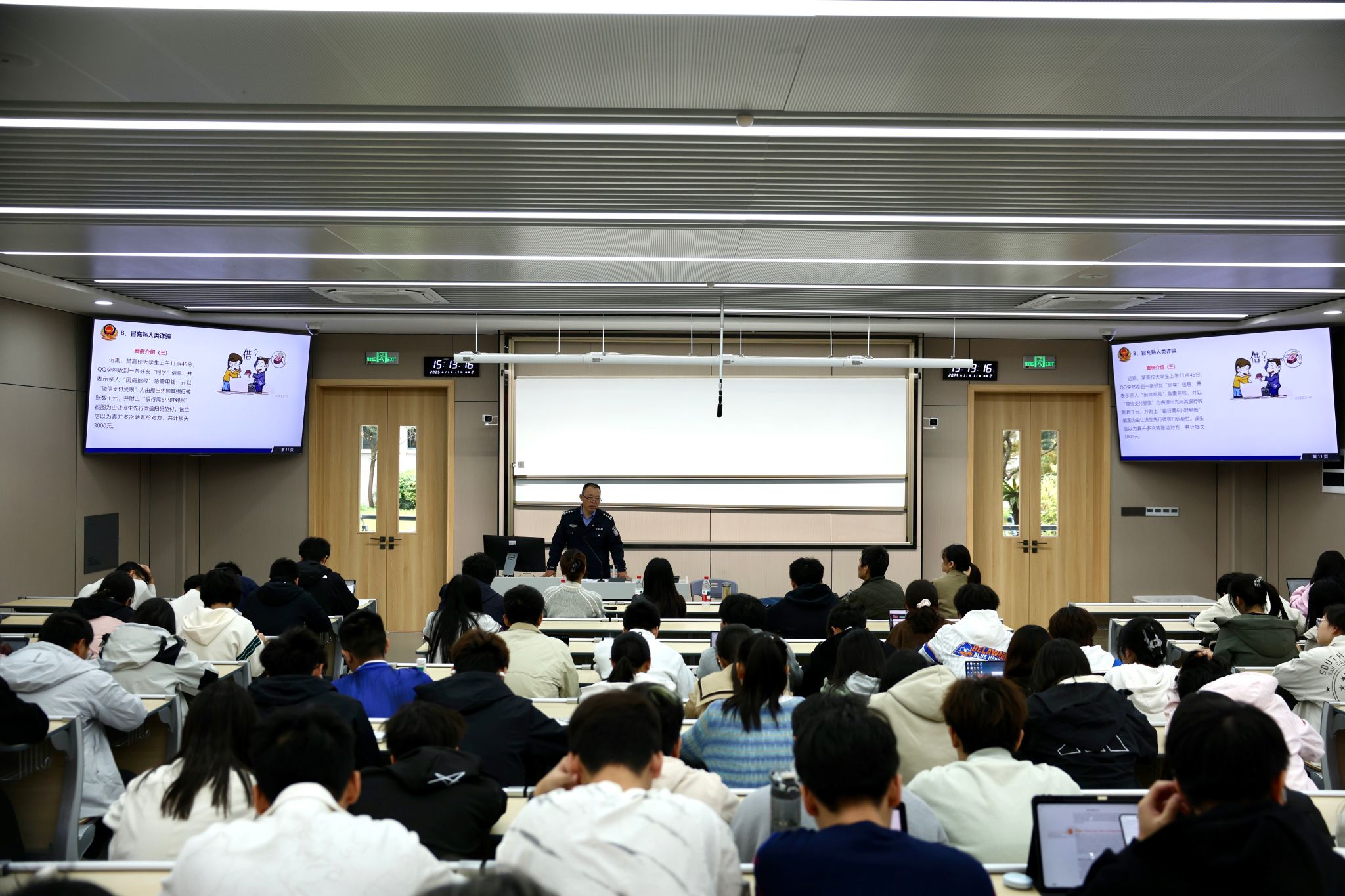 赵战华围绕电信网络新型违法犯罪的防范展开讲解,通过真实案例、现场图片与视频资料,以通俗易懂的语言深入剖析了刷单返利、校园贷、冒充熟人诈骗、情感诈骗及投资理财诈骗等常见手段的套路与逻辑。他特别提醒同学们增强法律意识,注意校园生活中易被忽视的法律风险,切实守护个人财产与人身安全。