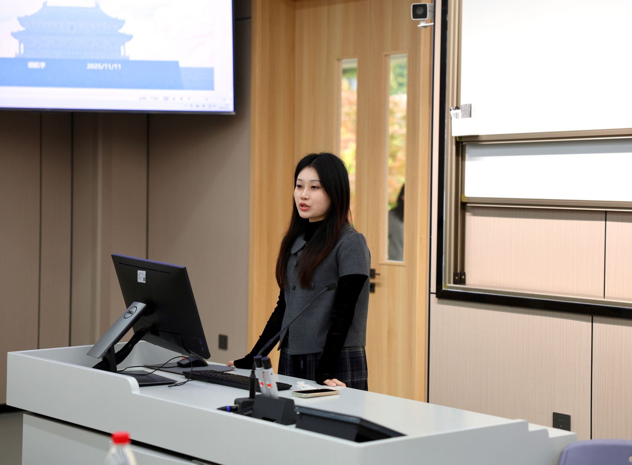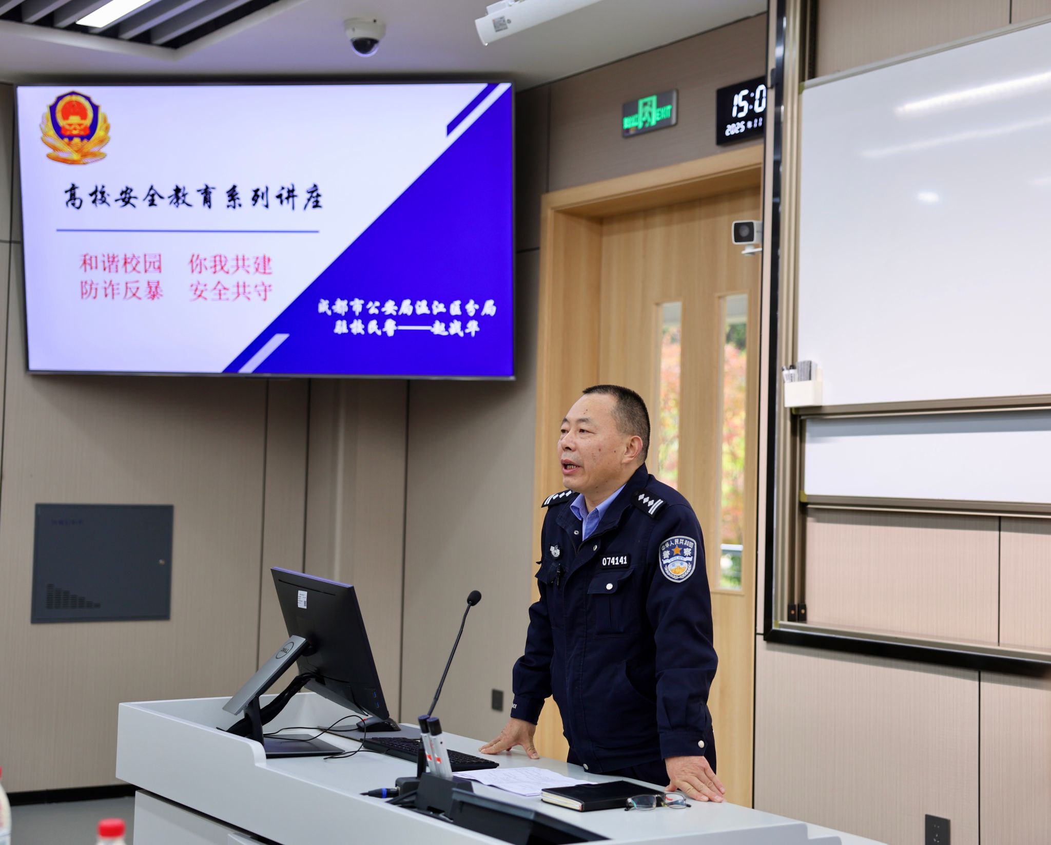 罗松涛就“消防和治安安全教育”进行宣讲。他提到,2025年11月9日是第34个全国消防日,今年消防宣传月的主题为“全民消防、生命至上——安全用火用电”。针对校园作为人员密集场所的特点,他重点讲解了常见火灾隐患,并配以大量实景图片,直观展示学生日常生活中可能存在的错误用电行为。