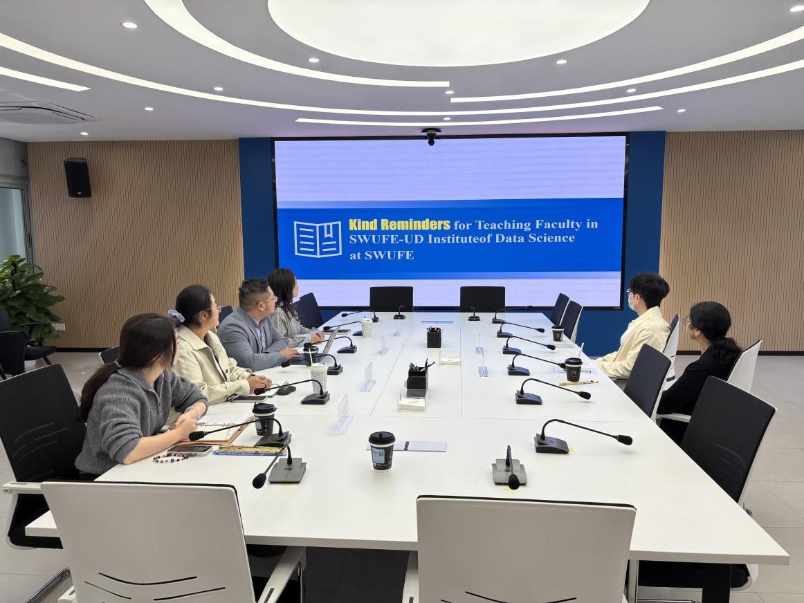 教学副院长何熙琼、美方教师Uma Velury与XIE Jiaheng,以及教学与质量保障办公室卢琦、鲁元鸿、陈美儒共同参会,就后半学期教学重点进行沟通。